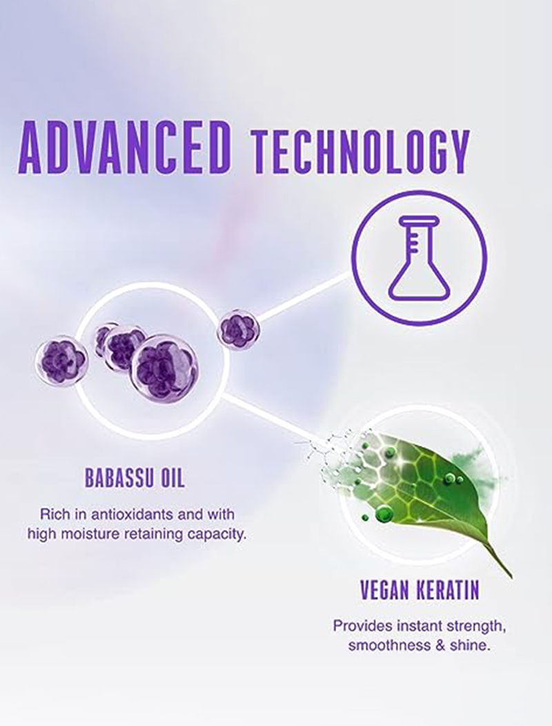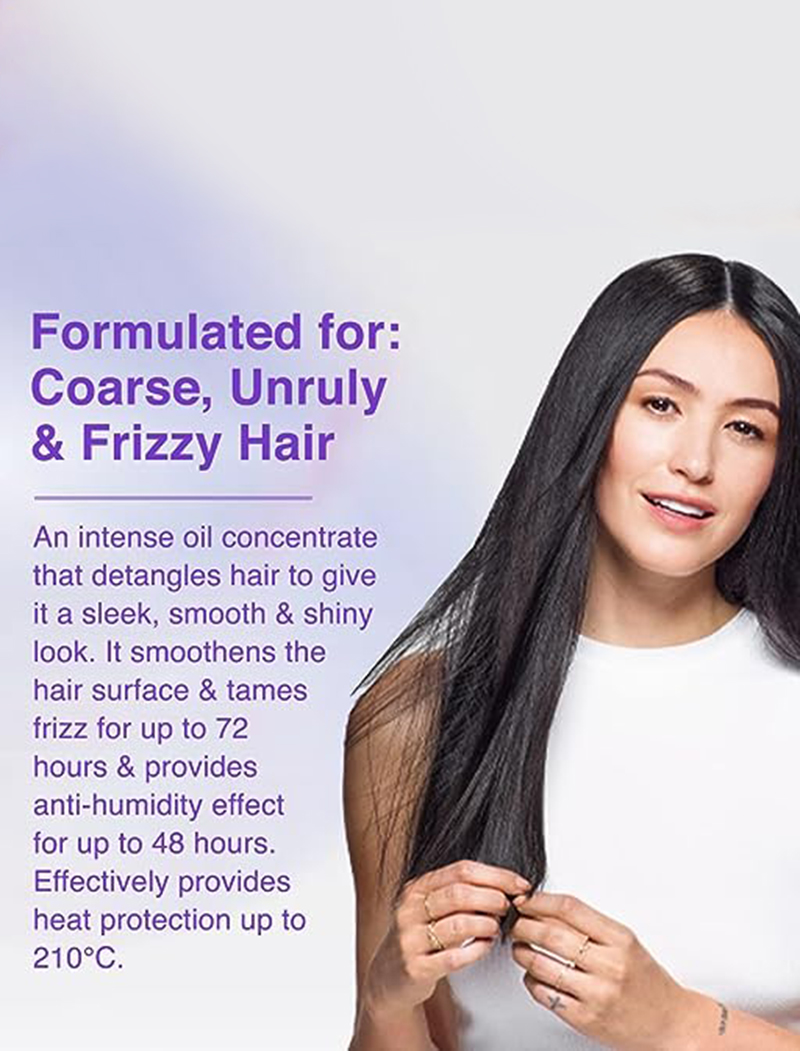 An intense oil that provides up to 210 degrees heat protection, detangles action leaving hair sleek & smooth, tames the frizz for up to 72 hours and has an anti-humidity effect of 48 hours, suitable for unruly and coarse hair