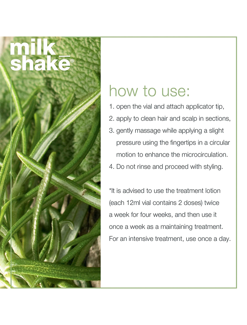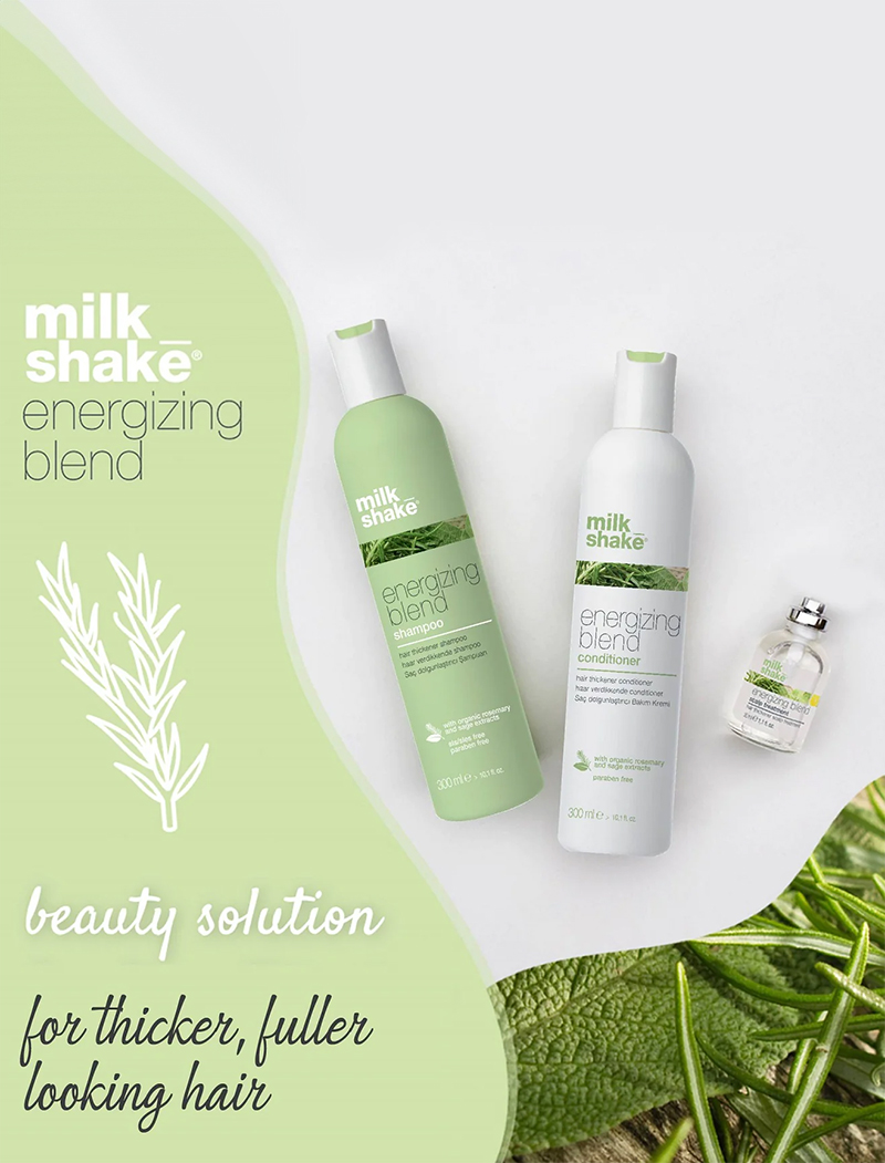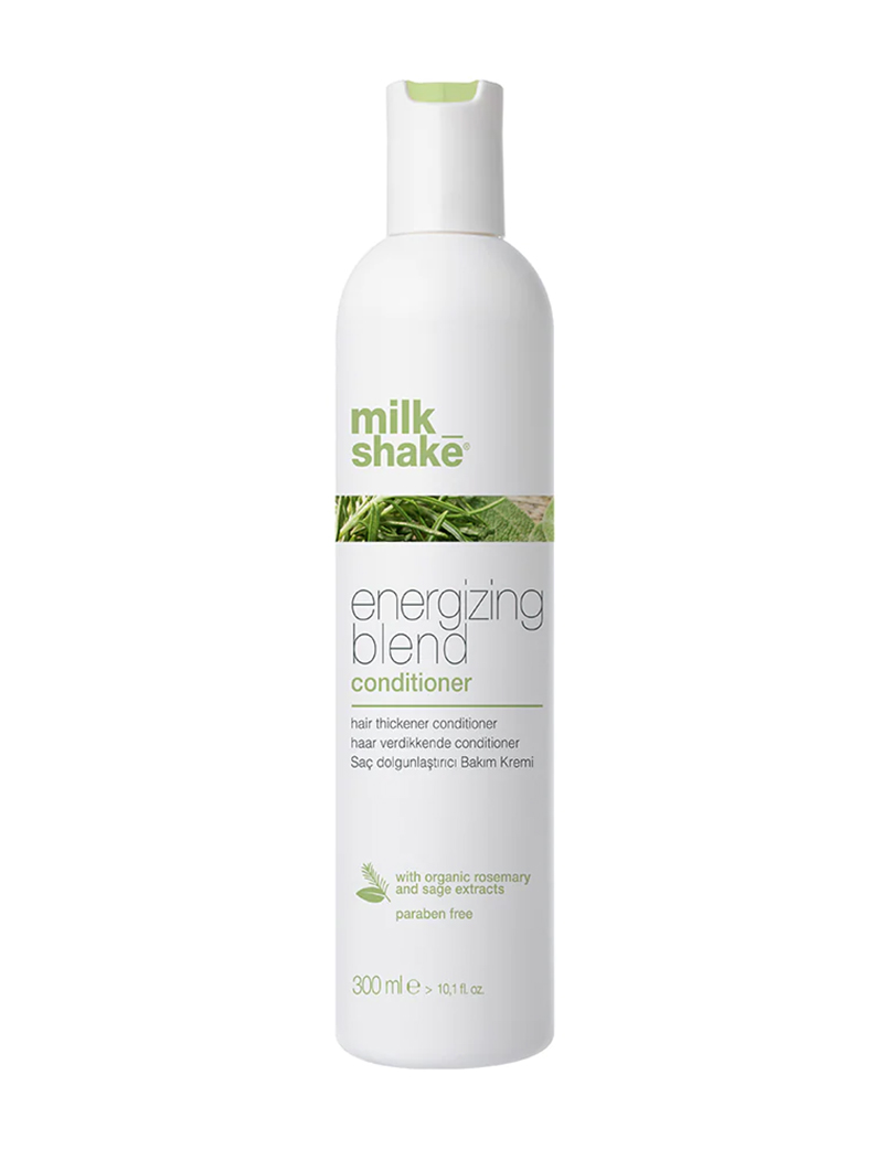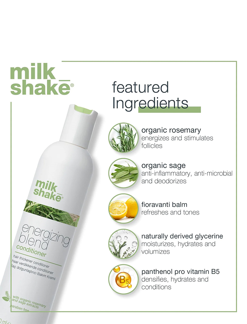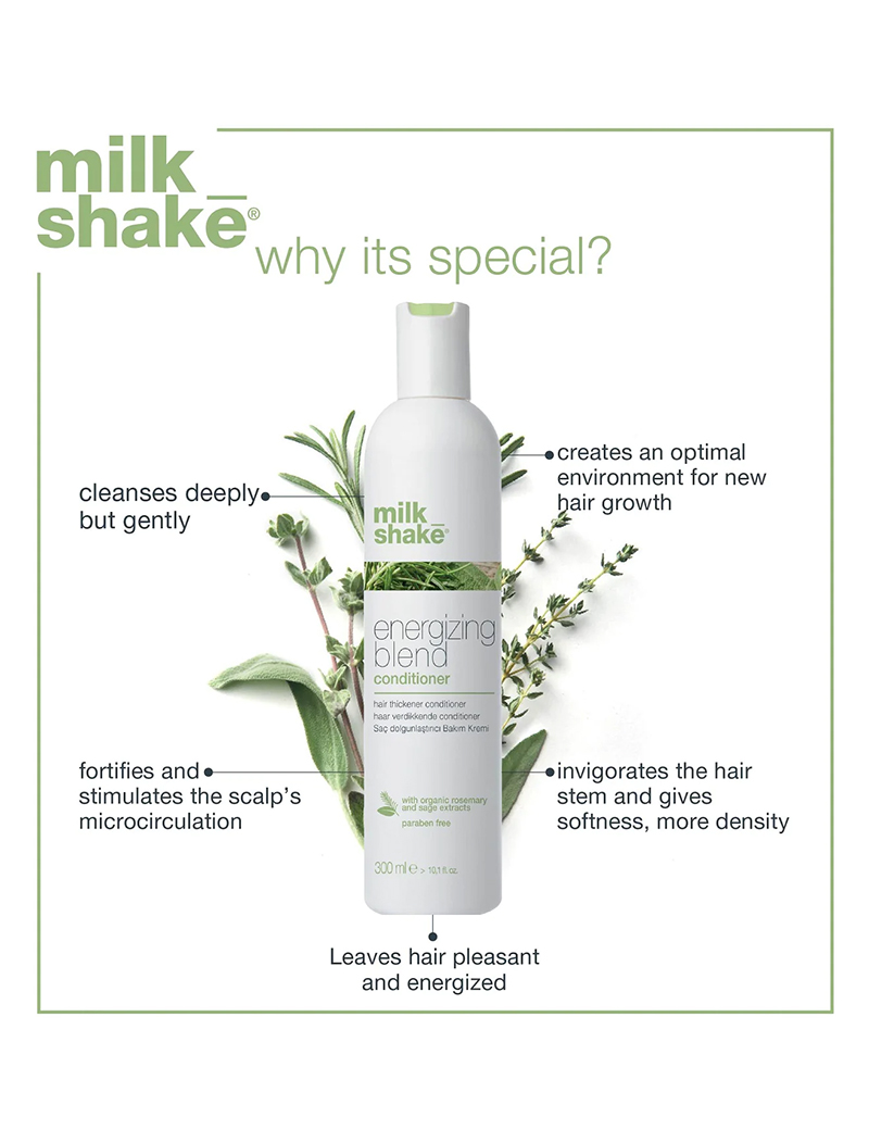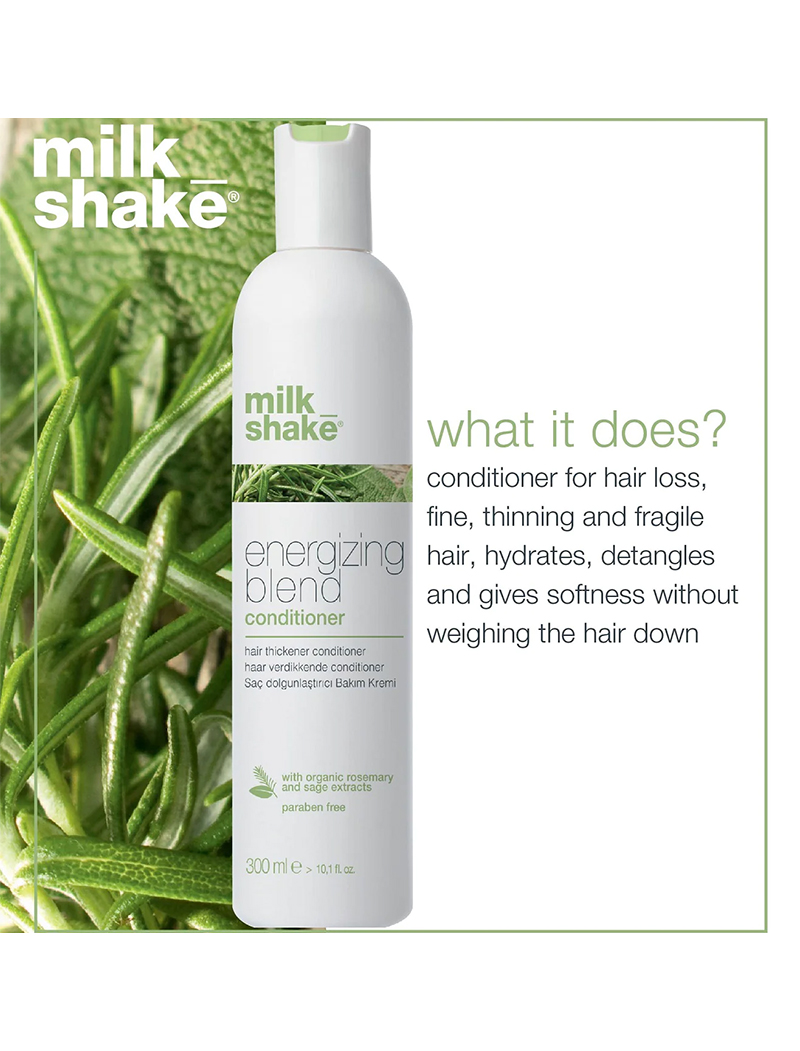 milk_shake energizing blend conditioner is for fine, thinning and fragile hair, hydrating, detangling and providing softness without weighing the hair down. The natural powers in organic rosemary, sage and fioravanti balm extract purifies hair while stimulating the scalp’s micro-circulation to create an optimal environment for new hair growth. The blend of botanical extracts and special conditioners invigorates the hair stem and gives softness. Panthenol provides more density to the hair, and essential oils and eucalyptus instil a pleasant energizing feeling, leaving the scalp refreshed.