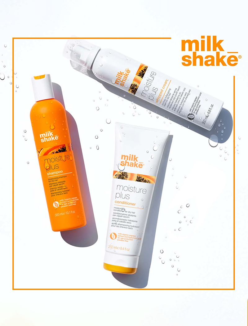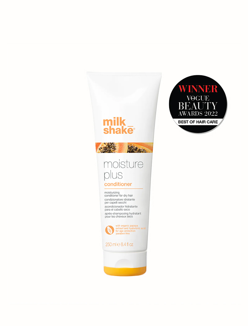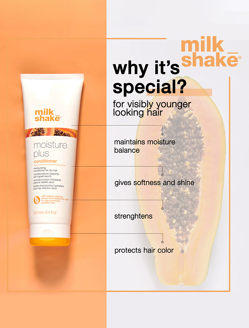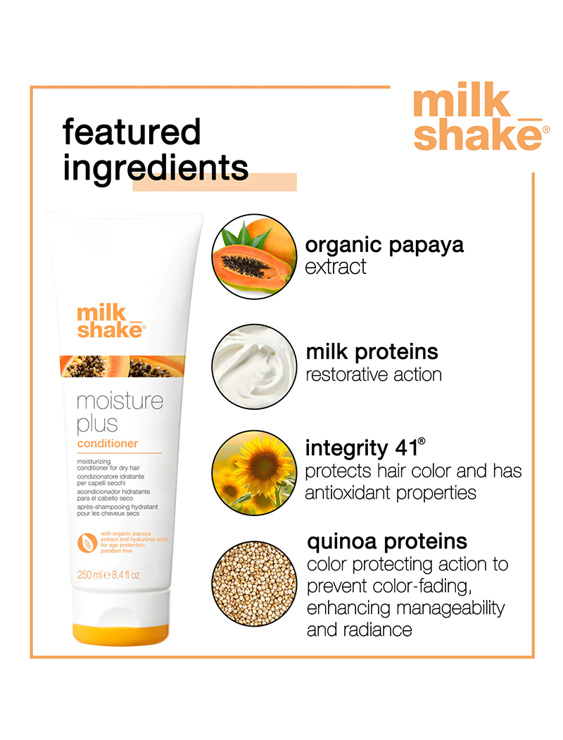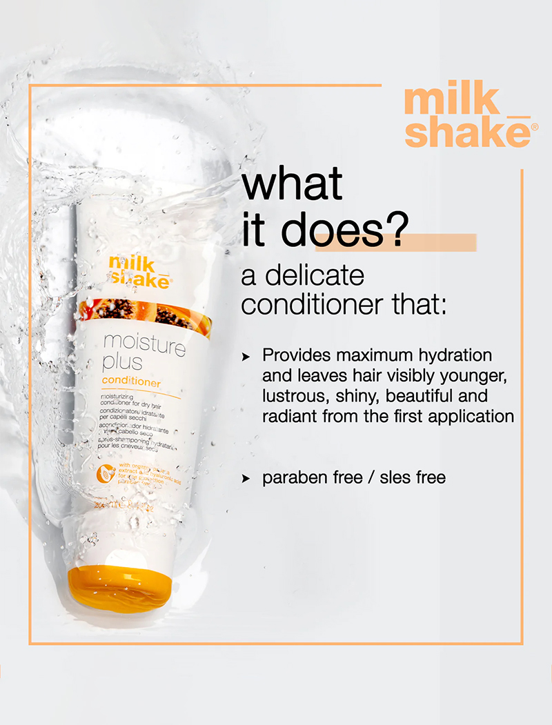 milk_shake Moisture Plus Conditioner is a moisturizing conditioner for dry hair. It improves softness and manageability while maintaining optimal moisture balance. Leaves hair lustrous, shiny, beautiful and radiant from the first application, it has results on the hair: maximum hydration and visibly younger hair. It contains organic papaya extract, Integrity 41® and hyaluronic acid with anti-aging properties. Protects hair color. Paraben-free.