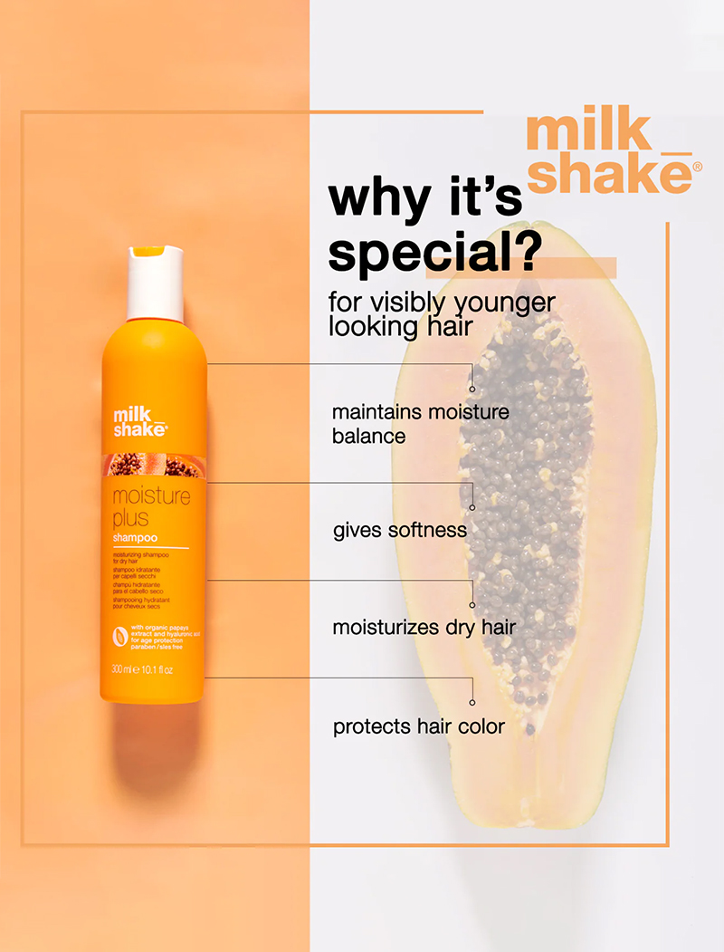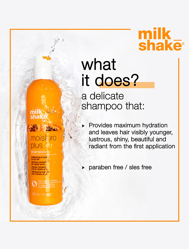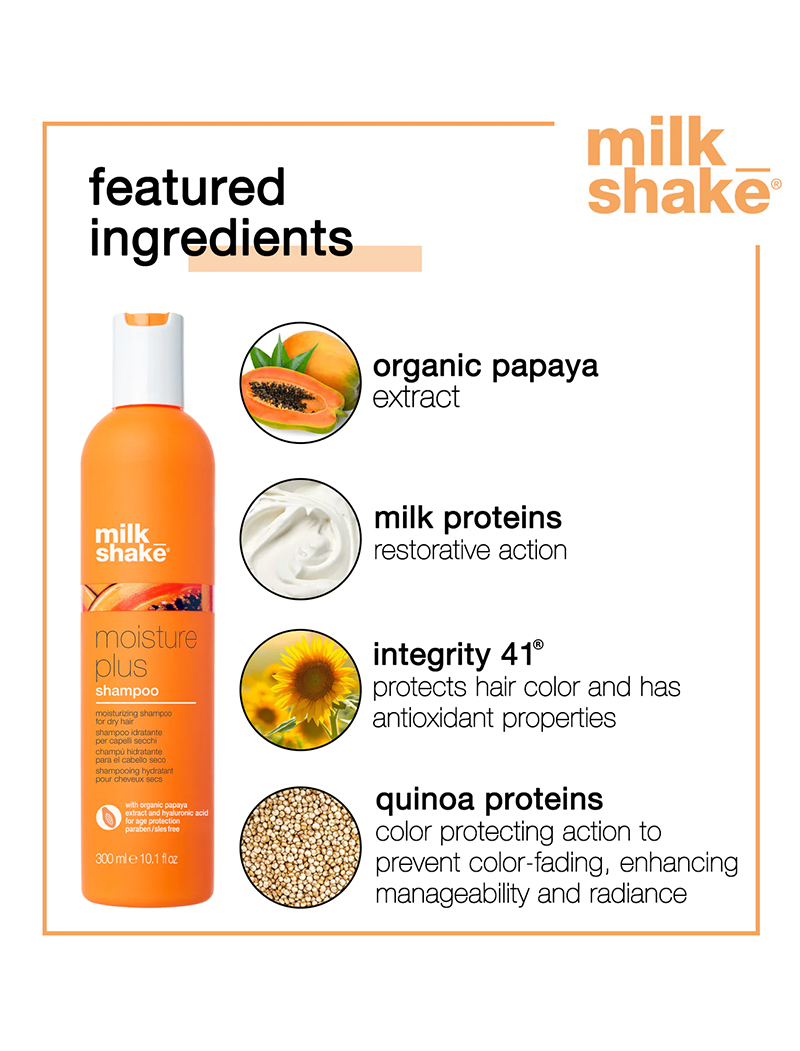 milk_shake moisture plus shampoo is a moisturizing shampoo for dry hair. It improves softness and manageability while maintaining the optimal moisture balance. It gives the sensation of healthy hair with brand new formulas and a delicious fragrance. Enriched with organic papaya extract and with low molecular weight, this shampoo leaves hair lustrous, shiny, beautiful, and radiant from the first application, it has results on the hair: maximum hydration and visibly younger hair. It contains organic papaya extract, Integrity 41®, and hyaluronic acid with anti-aging properties. Protects hair color. SLES and paraben-free.