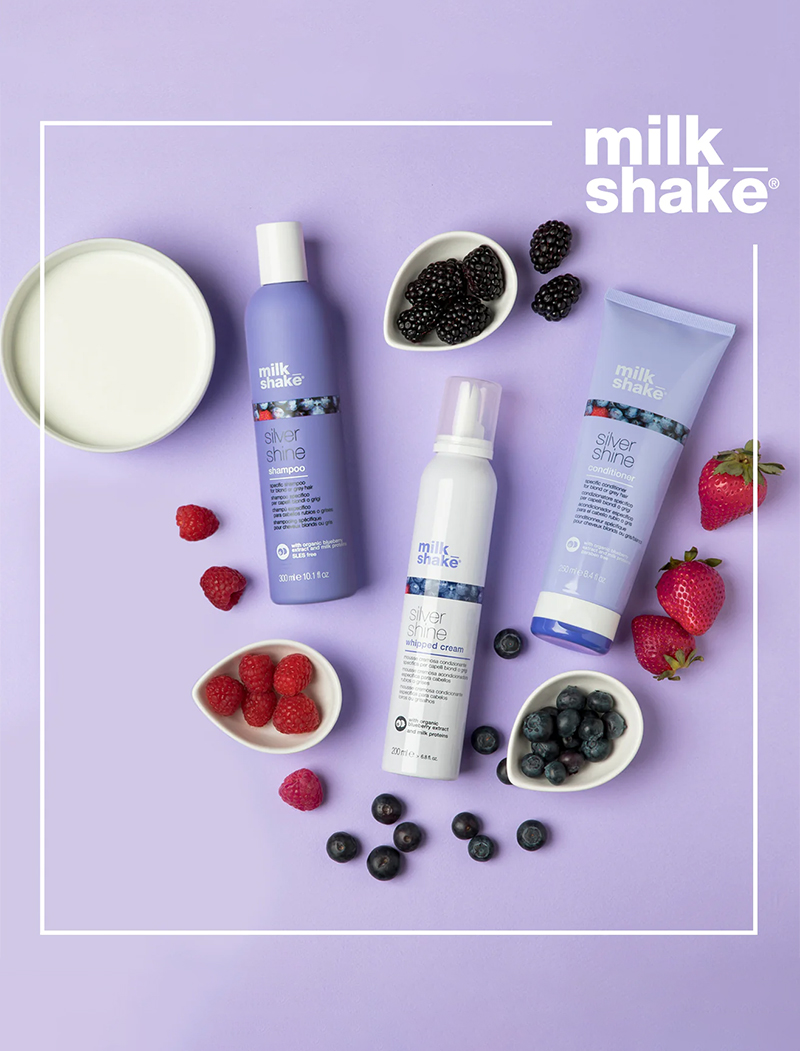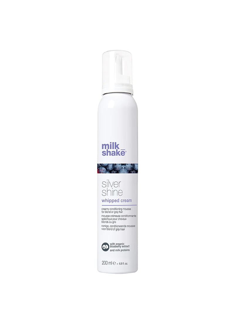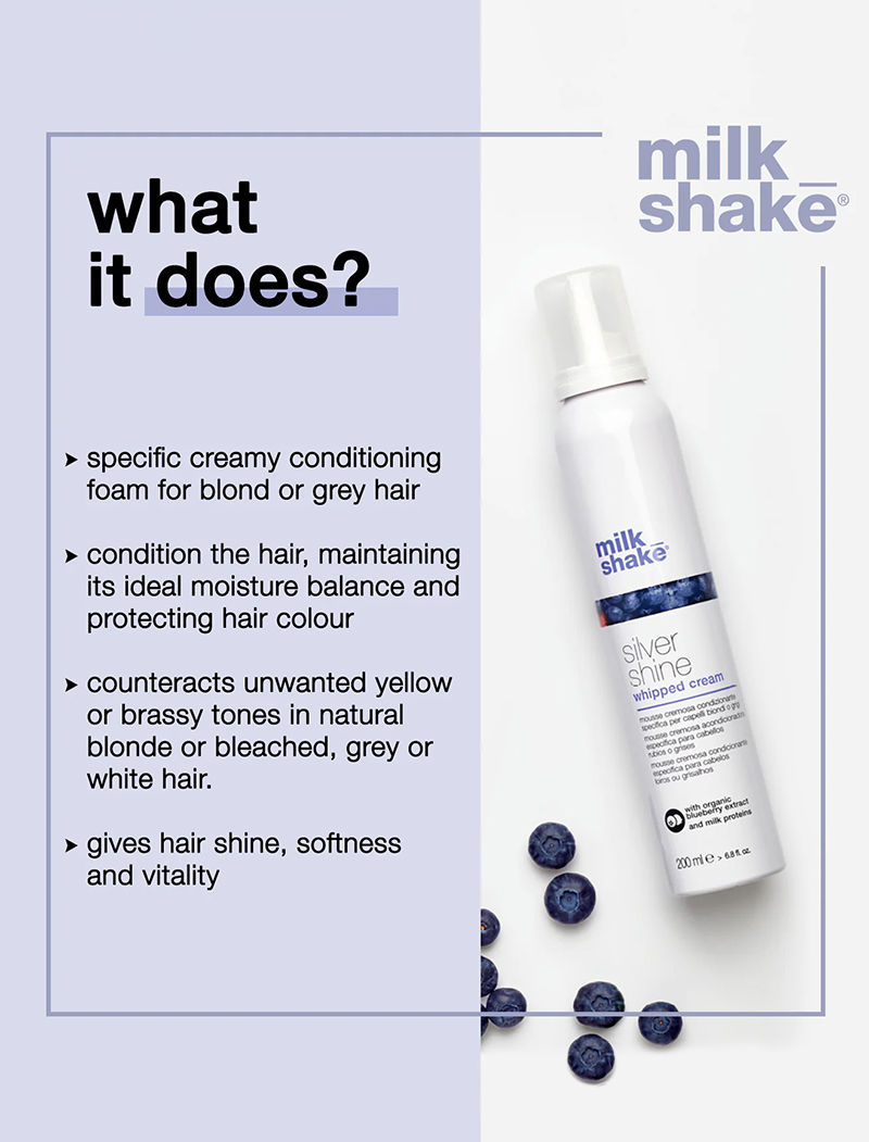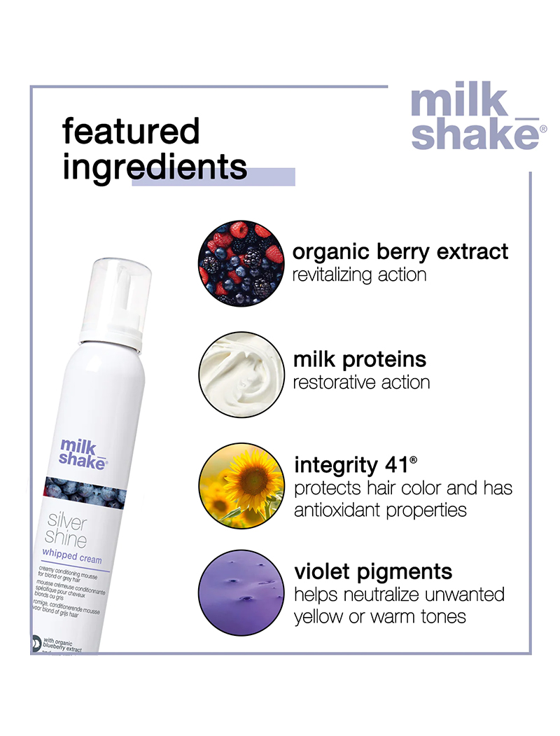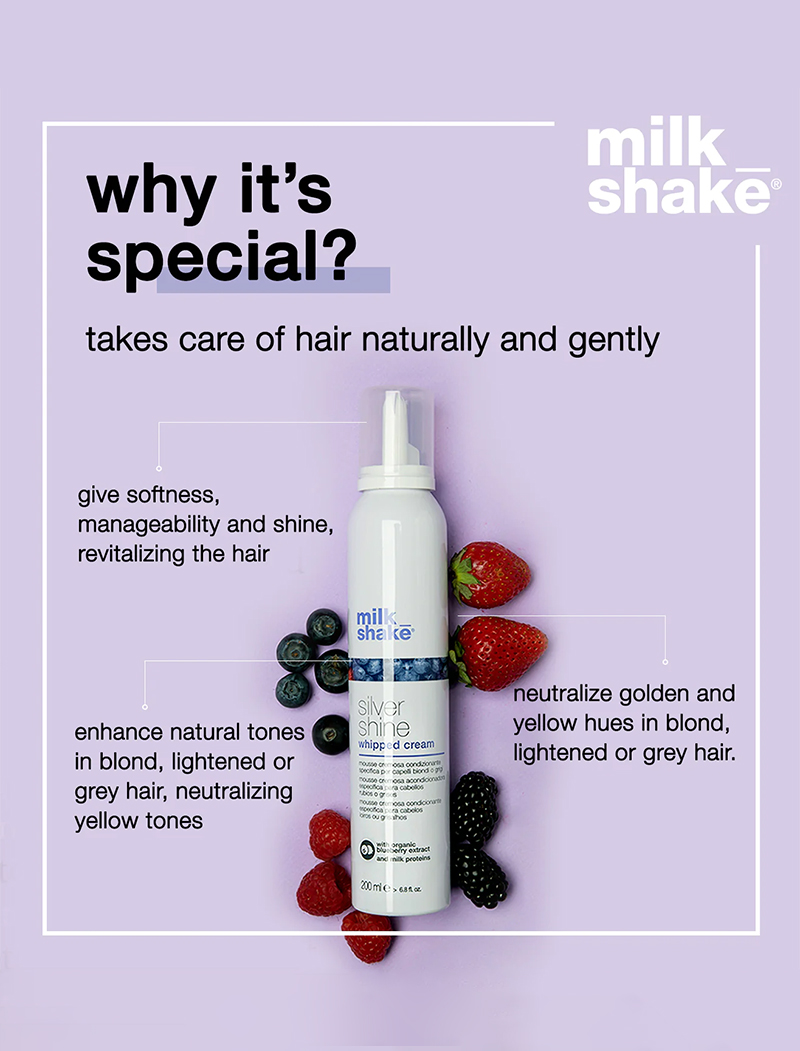 milk_shake Silver Shine Whipped Cream will neutralize yellow tones and delicately condition hair in one gesture. The special violet pigment and organic mixed berries extracts, combined with milk proteins and Integrity 41* preserve hair colour, counteracting unwanted yellow tones. As well detangling the hair, milk_shake Silver Shine Whipped Cream makes blonde, lightened, grey or white hair soft and shiny.